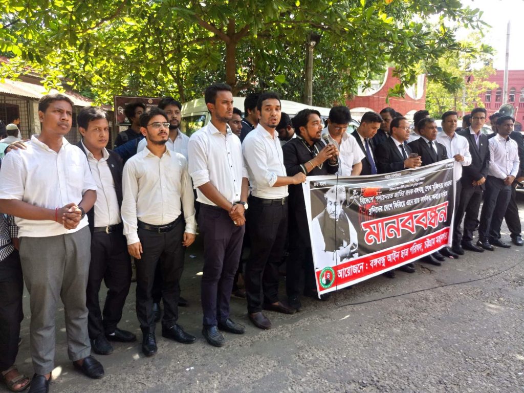 ১৬ই আগস্ট বঙ্গবন্ধু আইন ছাত্র পরিষদ চট্টগ্রাম মহানগর শাখার উদ্যোগে চট্টগ্রাম কোর্টবিল্ডিং চত্বরে সংগঠনের সভাপতি সঞ্জয় মহাজনের সভাপতিত্বে এবং সাধারণ সম্পাদক পার্থ নন্দীর সঞ্চালনায় বঙ্গবন্ধুর আত্ম-স্বীকৃত পলাতক খুনিদের বিদেশ থেকে ফিরিয়ে এনে ফাঁসির রায় কার্যকর ও খুনি জিয়াউর রহমানের মরণোত্তর বিচারের দাবীতে এ মানববন্ধন অনুষ্ঠিত হয়।